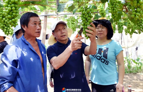 6月26日,在位于建阳区漳墩镇赖屯村的一家葡萄园,福建省农科院南平分院数字农业研究中心副主任、南平市农科所新技术研究室主任应薛养(左二)和省级科技特派员、南平市农科所农艺师徐非凡(右一)正在指导果农进行成果养护。