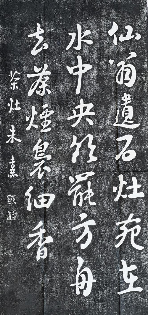 茶灶书法拓本。(衷玲英/供图) 《茶灶》全诗不拘泥于文人们汲水烹茶、寻茗赋诗的一般场面,而是看似随意地讲述远古仙翁遗事,让五曲水中的茶灶石笼罩在神秘之中。 后来,朱熹请来石匠在五曲巨石上镌刻“茶灶”两个大字。石刻南向,幅面60×150厘米,每字50×40厘米,距水面高度120厘米。 朱熹《茶灶》受到同代人和后来者的追捧,如杨万里、袁枢、陈梦庚、蔡廷秀、董天工等人都有应和唱咏之作。比如,朱熹的好友,南宋文学家、诗人杨万里诗赞:“茶灶本笠泽,飞来摘茶国。堕在武夷山,溪心化为石。”将茶灶石比喻为武夷五曲之心。另一位好友,南宋史学家袁枢诗云:“摘茗蜕仙岩,汲水潜虬穴。旋然石上灶,轻汎瓯中雪。清风已生腋,芳味犹在舌。何时棹孤舟,来此分余啜。”表达了对武夷山水、茗茶的留恋。