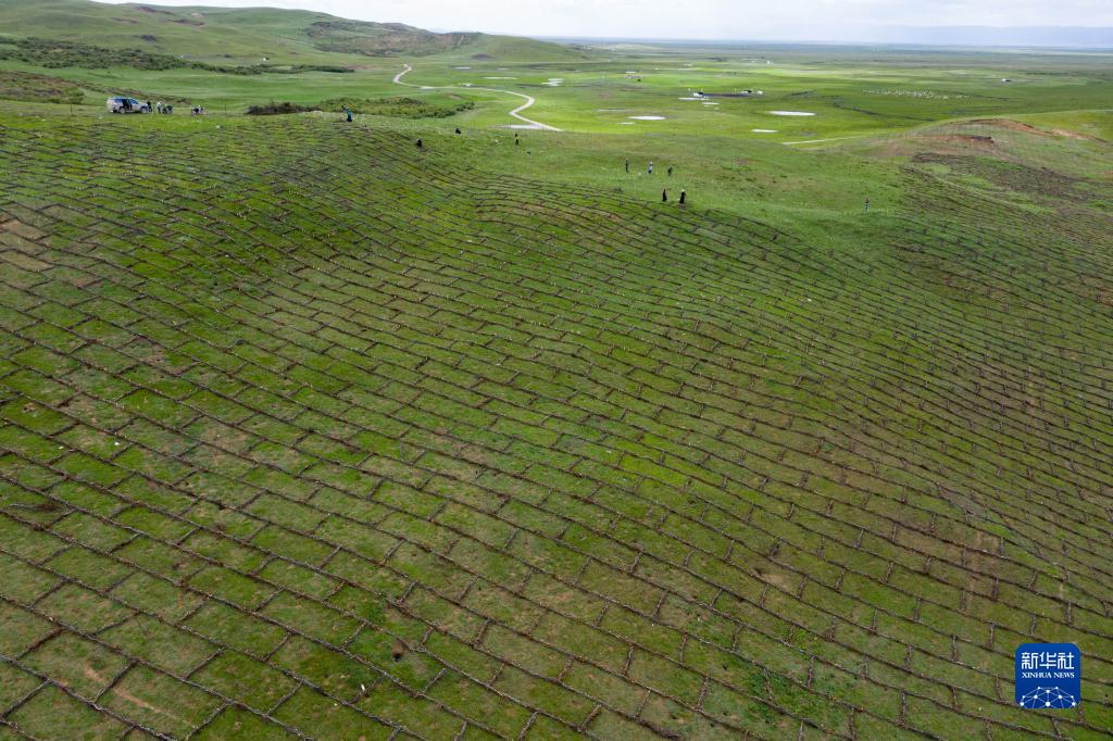 俯瞰若尔盖县麦溪乡黑河村一处治理后的草场(7月25日摄,无人机照片)。 从五月底开始,四川省若尔盖县麦溪乡黑河村村民在当地政府组织下,抓住雨水季节的有利时机,在草场开展防沙治沙工作。 近年来,地处川西北高原的若尔盖草原针对退化草场实施禁牧,同时采用“高原柳沙障+灌草复合种植”的治沙模式,实施退化草原修复和改良工程,因地制宜建设灌草相结合的防护林体系,提升防沙治沙效果,遏制草原退化沙化。 新华社记者 江宏景 摄