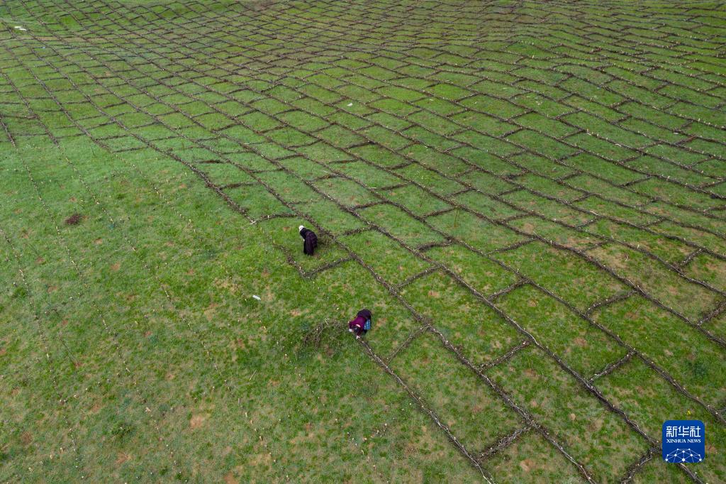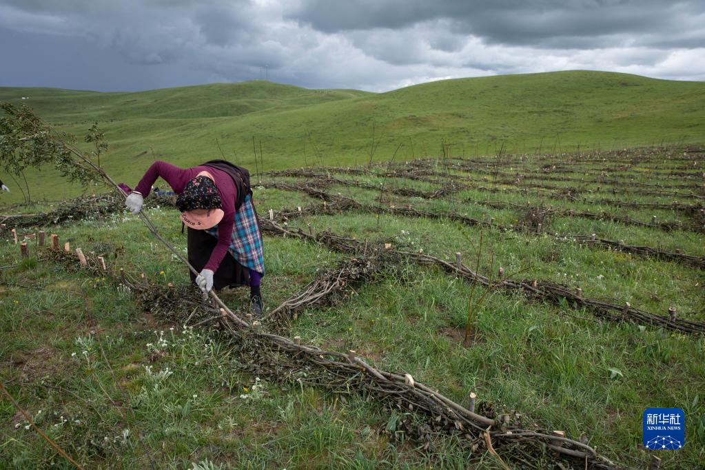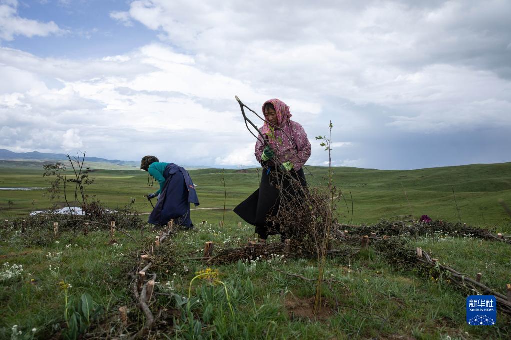 7月25日,在若尔盖县麦溪乡黑河村,村民用高原柳编成沙障。 从五月底开始,四川省若尔盖县麦溪乡黑河村村民在当地政府组织下,抓住雨水季节的有利时机,在草场开展防沙治沙工作。 近年来,地处川西北高原的若尔盖草原针对退化草场实施禁牧,同时采用“高原柳沙障+灌草复合种植”的治沙模式,实施退化草原修复和改良工程,因地制宜建设灌草相结合的防护林体系,提升防沙治沙效果,遏制草原退化沙化。 新华社记者 江宏景 摄