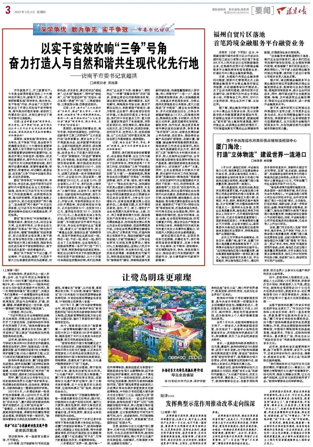 《福建日报》2023年3月2日第03版 以实干实效吹响“三争”号角 奋力打造人与自然和谐共生现代化先行地 ——访南平市委书记袁超洪 开年就是开工,开工就要实干。今年是全面贯彻落实党的二十大精神的开局之年。新春开工第一天,省委即部署实施“深学争优、敢为争先、实干争效”行动,向全省广大党员干部发出了开局之年加油干的冲锋号角,南平是如何落实省委、省政府工作要求的?近日,本报记者专访了南平市委书记袁超洪。