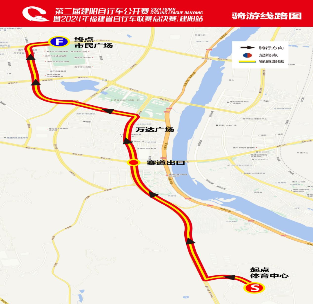 2024年12月22日,福建省自行车联赛(建阳站)将在建阳城区举行,为了确保自行车联赛的顺利举办,按照相关法律法规规定,决定在自行车联赛期间对部分路段采取交通管制措施,具体通告如下: 一、骑行路线 荣誉骑游线路:南平市体育中心北门——体育路——建平大道——大红袍路——云谷大道——南林大街——市民广场——崇阳溪漫游道。