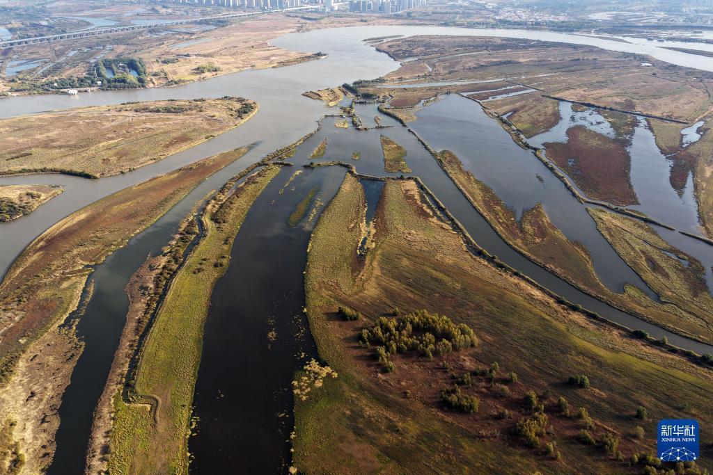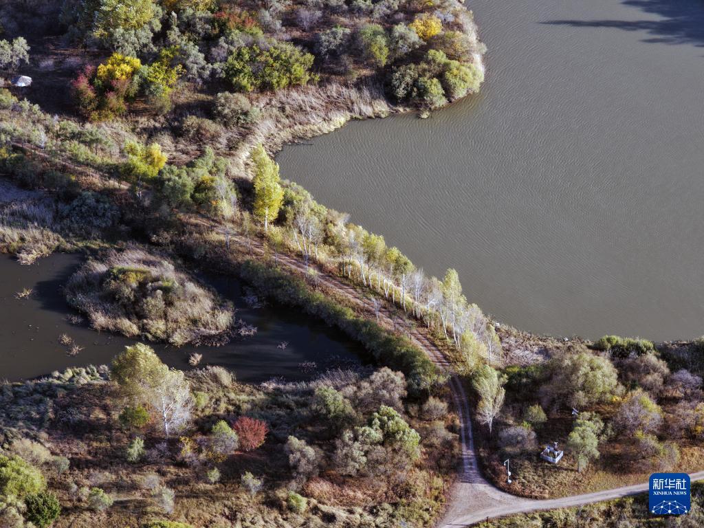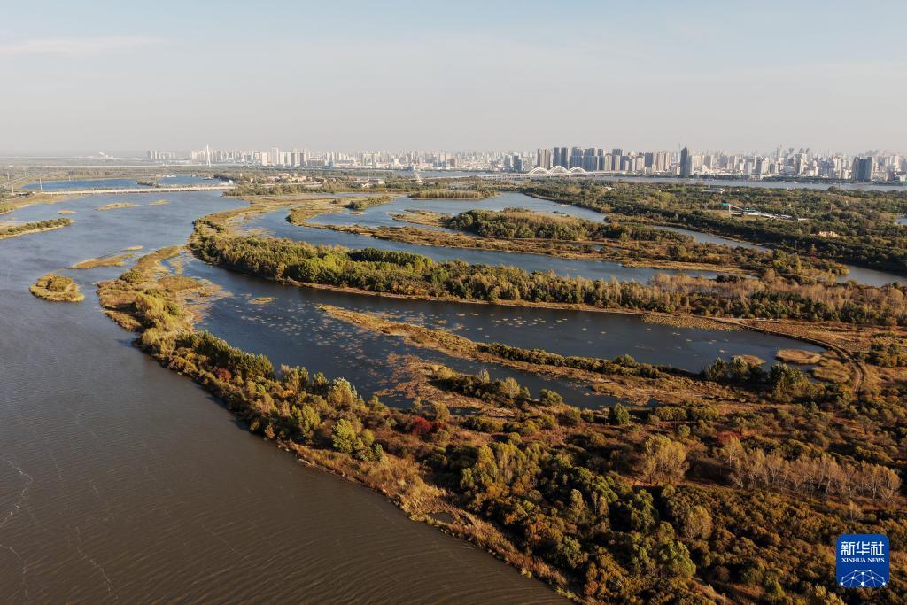 这是10月7日拍摄的哈尔滨金河湾湿地公园景色(无人机照片)。 10月的哈尔滨,湿地秋意醉人,一幅生态与人文交相辉映的美丽画卷沿江展开。 哈尔滨湿地资源丰富,现有湿地名录面积4.05万公顷,百里生态长廊的图景构成了一条壮阔的城市湿地景观带。 新华社记者 王松 摄