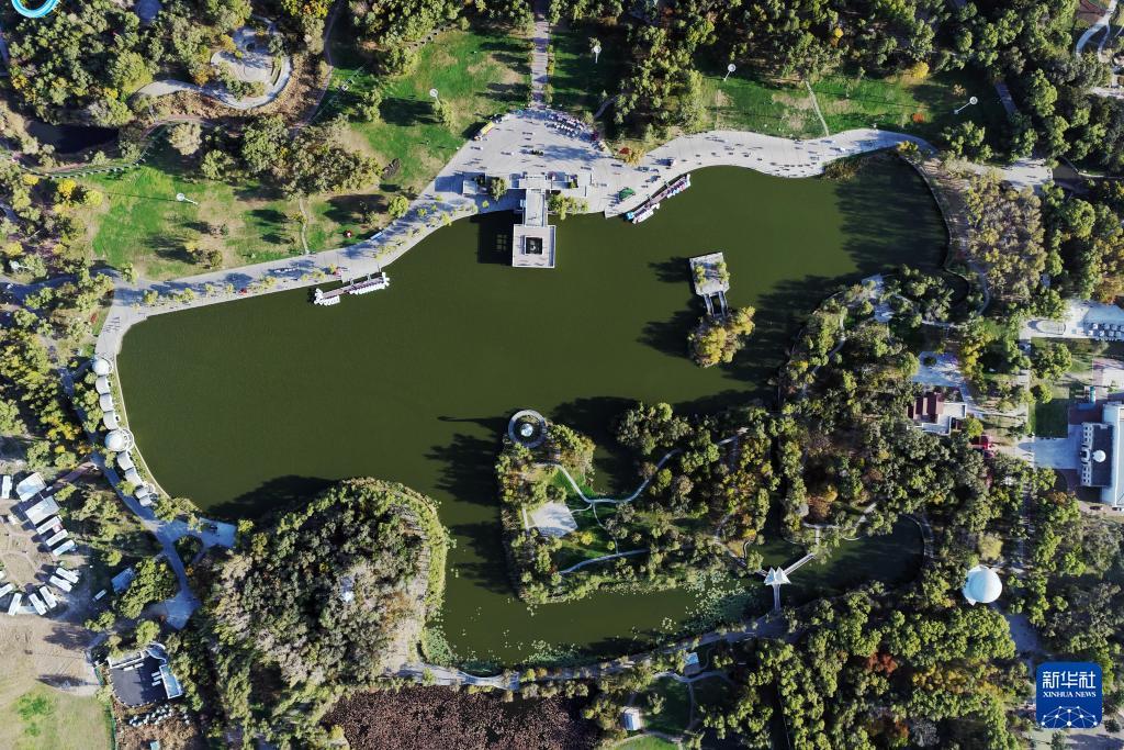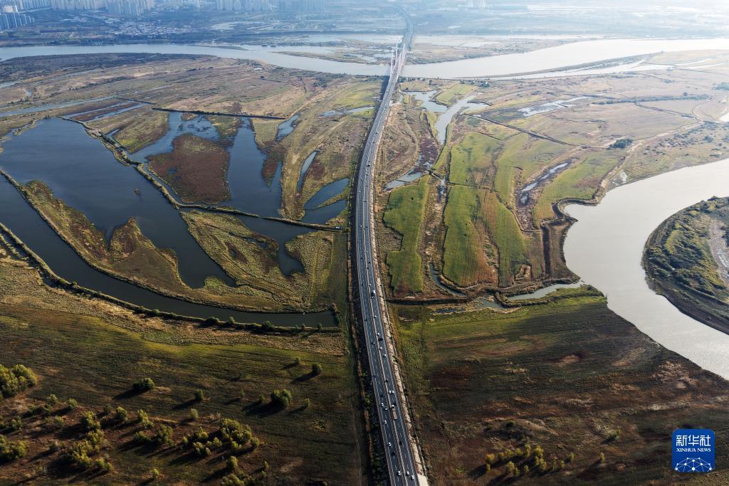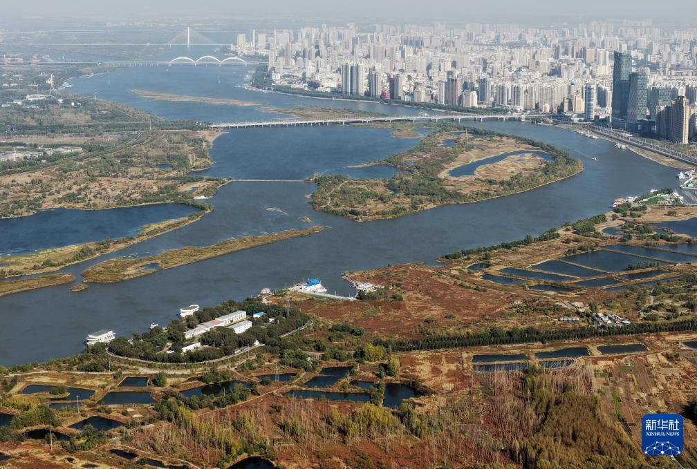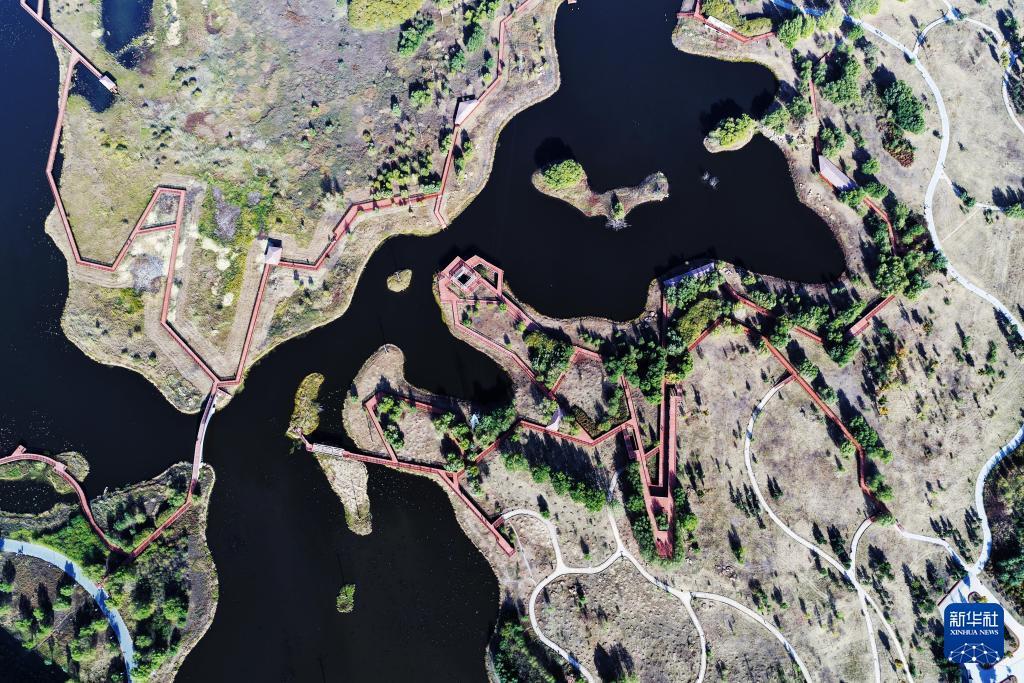 这是10月7日拍摄的哈尔滨群力外滩湿地公园景色(无人机照片)。 10月的哈尔滨,湿地秋意醉人,一幅生态与人文交相辉映的美丽画卷沿江展开。 哈尔滨湿地资源丰富,现有湿地名录面积4.05万公顷,百里生态长廊的图景构成了一条壮阔的城市湿地景观带。 新华社记者 王松 摄