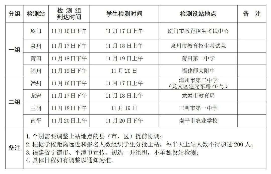 根据2026年度空军招飞工作安排,11月17日至11月20日,空军招飞局南京选拔中心将派初选组赴福建省各地市对报考空军飞行学员的学生进行检测。 相关通知已通过各地教育招生部门发至各学校,敬请关注! 2026年度福建省空军招飞 初选日程安排如下 ↓