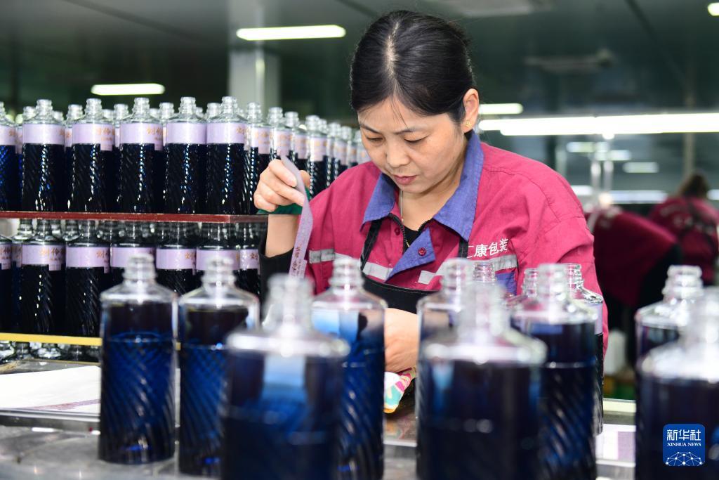 11月27日,在郓城县丁里长街道烟郓科技产业园,工作人员为酒瓶贴花。 近年来,山东省菏泽市郓城县丁里长街道链条式、集群化发展酒类包装产业,并将采煤塌陷区综合治理与发展特色养殖业相结合,不断通过产业兴旺助推乡村振兴。 新华社记者 郭绪雷 摄
