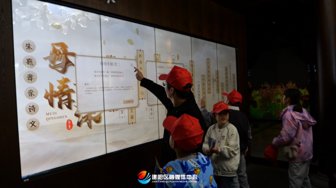 冬阳和煦,青瓦静谧。在寒泉精舍古韵盎然的院落里,来自旭辉学校的15组亲子家庭正跟随社工,倾听朱熹与母亲之间的家风故事。展陈区前,爸爸们俯身牵起孩子的手,一同触摸光影交织的文化脉络,在传统与现代的融合中,悄然拉近了亲子间的距离。