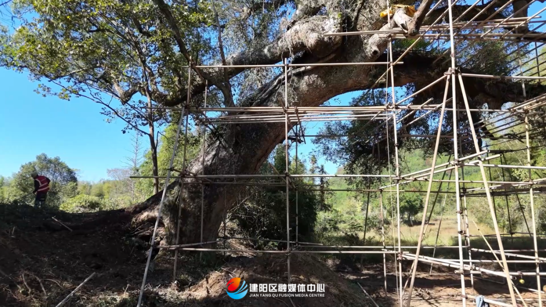 区林业局绿化办工作人员李梅:“在现场也看到它确实长势是比较衰落,经过各个专家的现场勘查,决定它是非常有必要进行抢救复壮的。 麻沙镇新溪村支部书记刘光泉:“这边以前都是田块分开,分给农户,农户就种毛竹。我们上次就是讲要保护古树,就把这个毛竹给它清掉。” 林业部门为这棵千年古树制定了科学的抢救复壮方案,经过枯枝修剪、树洞修补、树干加固、病虫害防治、围栏加设等一系列复壮举措,10天之后,麻沙新溪村的古樟重现新貌。