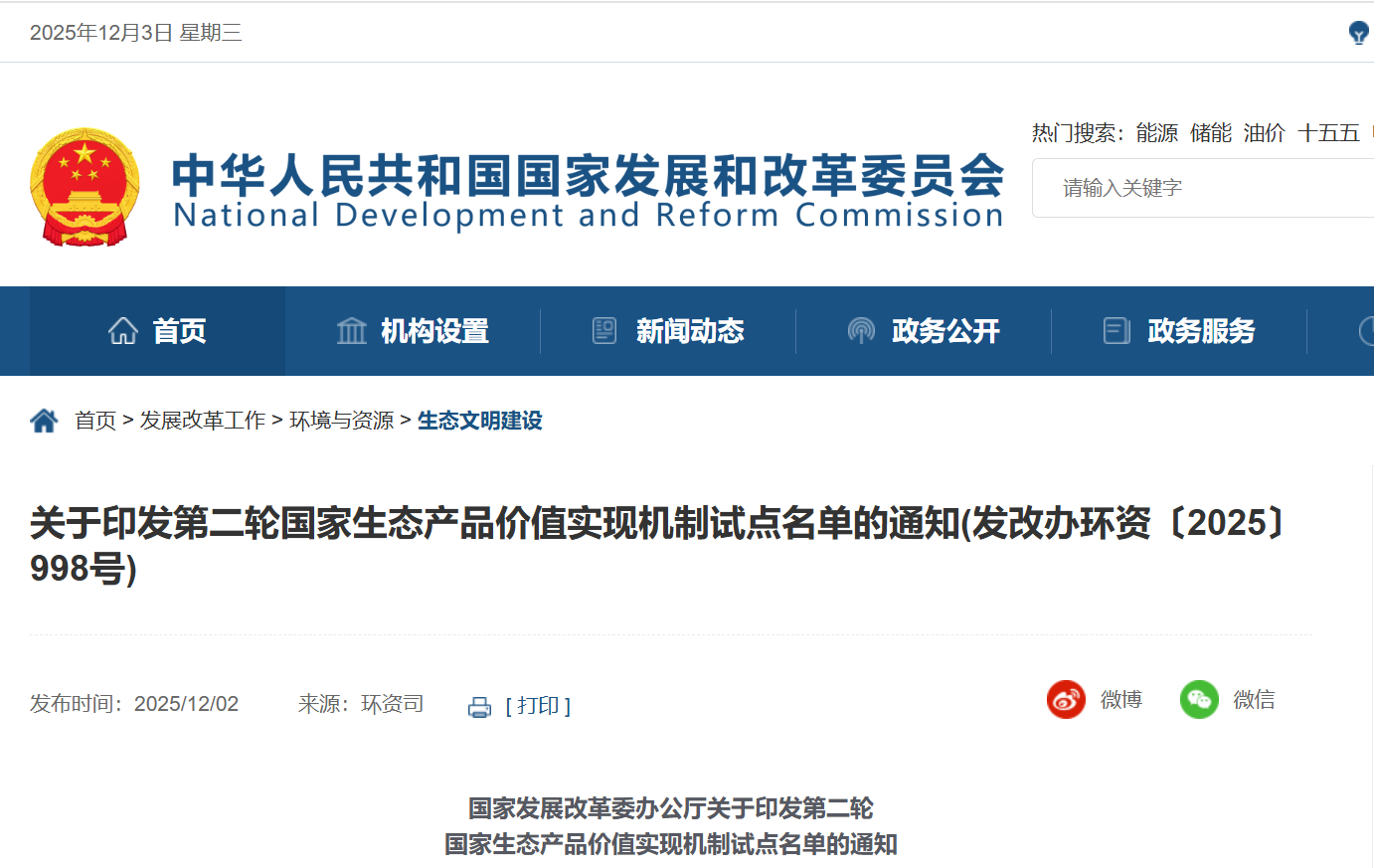 国家发展改革委办公厅关于印发第二轮国家生态产品价值实现机制试点名单的通知 发改办环资〔2025〕998号 国家林草局办公室,各省、自治区、直辖市发展改革委: 为深入贯彻党的二十大和二十届历次全会精神,认真落实党中央、国务院决策部署,加快推进中共中央办公厅、国务院办公厅《关于建立健全生态产品价值实现机制的意见》重点任务落实,经部门推荐、征求地方意见等程序,确定北京市密云区等25个地区和海南热带雨林国家公园为第二轮国家生态产品价值实现机制试点,试点期限为2026-2028年。现将第二轮试点名单予以公布,并就有关事项通知如下: 一、试点地区要围绕实现碳达峰目标,突出碳减排与生态产品价值实现工作相结合,推进降碳增绿、以碳生金、减碳惠民等模式路径,聚焦生态系统固碳、市场机制融碳等重点领域,加强生态系统碳汇资源开发,拓宽碳汇市场化交易路径,健全碳排放权等资源环境要素市场化交易机制,创新光伏治沙等“生态保护修复+可再生能源发展”模式,完善以商业激励、政策鼓励、减排量交易相结合的碳普惠机制。 二、试点地区省级发展改革委要指导试点地区科学编制试点申报书(实施方案),内容包括试点基础、总体思路、试点内容、进度安排、预期成果、保障措施等,应主题鲜明、重点突出、措施具体、成果可期。申报书(实施方案)经省级人民政府审核同意后,由省级人民政府于2025年12月31日前报送我委。以国家公园作为试点主体的,申报书(实施方案)经国家林草局审核同意后,由国家林草局报送至国家发展改革委。 三、试点地区省级发展改革委要会同财政、自然资源、生态环境、水利、农业农村、文化和旅游、人民银行、金融监管、统计、林草等部门强化各方面要素保障,在土地使用、资金统筹、项目审批等方面赋予试点地区改革授权,鼓励试、大胆改,留出试错、容错的空间,保护改革积极性。试点地区要大力开展政策制度创新试验,分类施策、因地制宜、循序渐进推进各项工作,着力破解现行制度框架体系下深层次瓶颈制约,以点带面形成示范效应,保障改革试验取得实效。 四、各省、自治区、直辖市发展改革委要积极开展省级生态产品价值实现机制试点工作,指导工作基础扎实、优质生态产品供给能力强的地区积极开展相关工作,及时总结推广经验做法、探索有效路径、形成典型案例。各地区和各相关部门不得多头开展分领域生态产品价值实现机制试点建设,已开展分领域试点建设的地区,相关工作统一纳入到国家或省级生态产品价值实现机制试点。 附件:第二轮国家生态产品价值实现机制试点名单 国家发展改革委办公厅 2025年11月24日 附件 第二轮国家生态产品价值实现机制试点名单 北京密云区、天津宁河区、河北张家口市、山西长治市、内蒙古呼伦贝尔市、辽宁本溪市、吉林通化市、上海崇明区、江苏宿迁市、福建三明市、江西吉安市、山东东营市、河南信阳市、湖北十堰市、湖南岳阳市、广东云浮市、重庆武隆区、四川广元市、贵州铜仁市、云南普洱市、西藏林芝市、甘肃张掖市、青海海南藏族自治州、宁夏固原市、新疆阿勒泰地区和海南热带雨林国家公园 |
