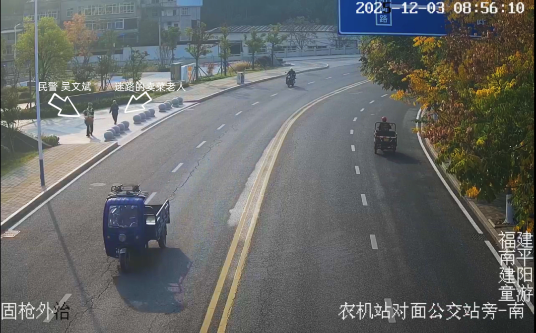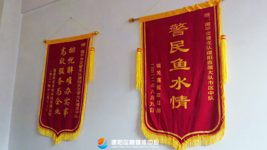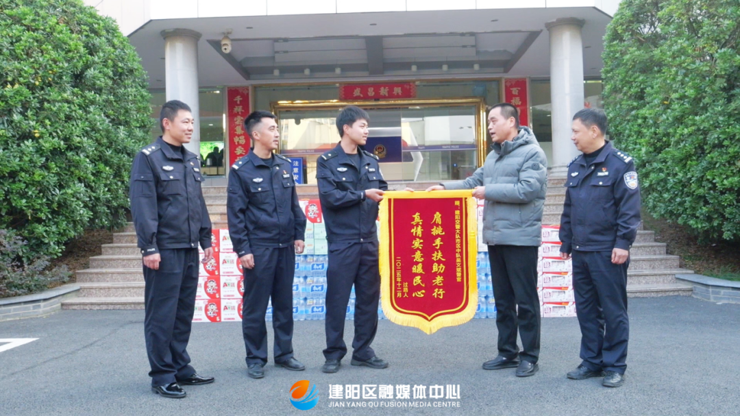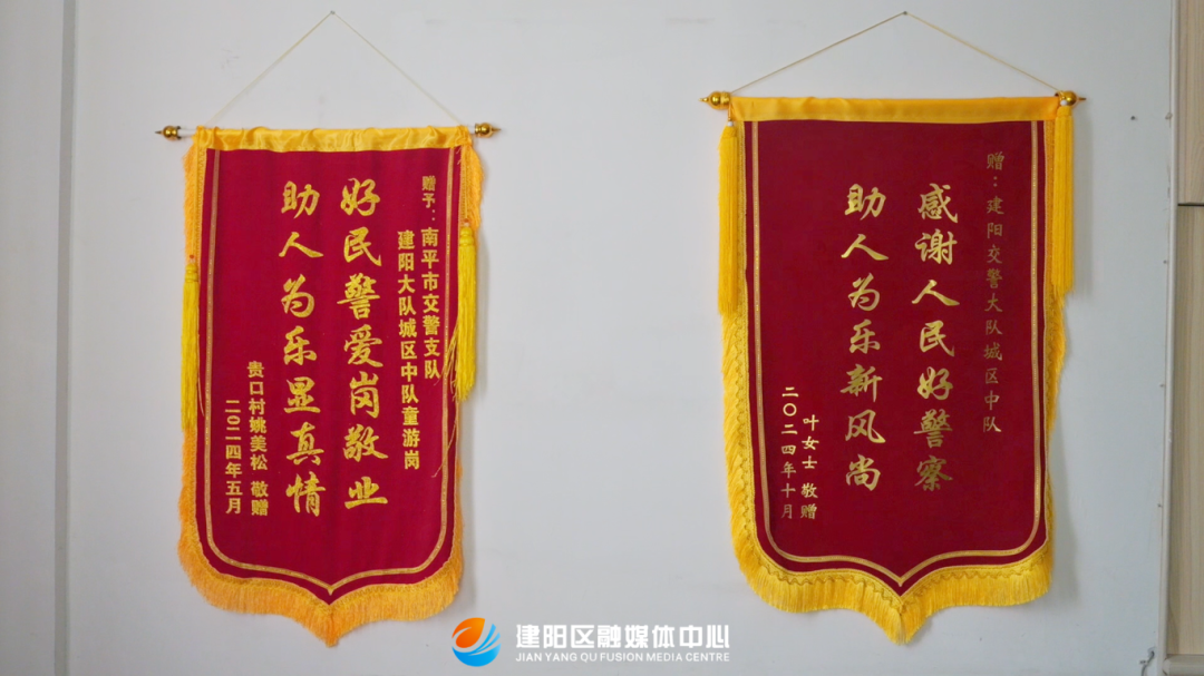 监控画面 南平市公安局交通管理支队建阳大队四级警长吴文斌:“早上8点半左右,我在路口执勤,就看到有一位老人家背了两大筐菜,很迷茫的站在那。我就过去问她是否需要帮助,她说要送去童游农贸市场,但是迷路了。我刚好在五福桥路口执勤,就背上她的扁担,我一路把老人送到童游农贸市场。” 这段约15分钟的路程,被路过的市民看在眼里。他用手机记录下了吴文斌挑扁担、扶老人的身影。隔天下午,他带着一面精心制作的锦旗来到市公安局交通管理支队建阳大队。锦旗上写着“肩挑手扶助老行 真情实意暖民心”十四个金色大字。