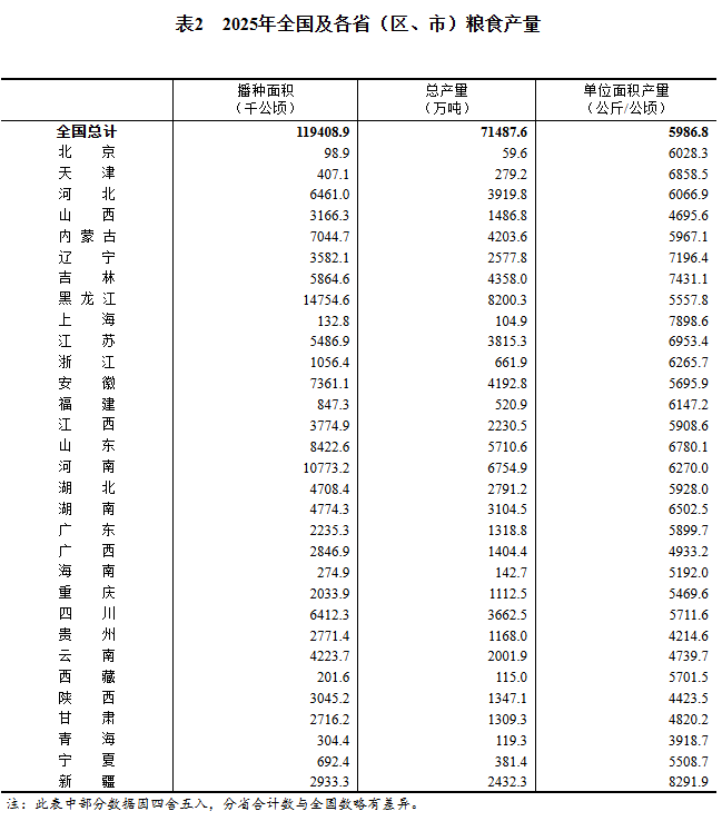 根据对全国31个省(区、市)的调查,2025年全国粮食播种面积、单位面积产量和总产量分别如下: 一、全国粮食播种面积119409千公顷(179113万亩),比2024年增加90千公顷(135万亩),增长0.1%。其中谷物[1]播种面积100619千公顷(150928万亩),比2024年增加161千公顷(241万亩),增长0.2%。 二、全国粮食单位面积产量5987公斤/公顷(399公斤/亩),比2024年增加65.7公斤/公顷(4.4公斤/亩),增长1.1%。其中谷物单位面积产量6561公斤/公顷(437公斤/亩),比2024年增加68.3公斤/公顷(4.6公斤/亩),增长1.1%。 三、全国粮食总产量71488万吨(14298亿斤),比2024年增加838万吨(168亿斤),增长1.2%。其中谷物产量66021万吨(13204亿斤),比2024年增加792万吨(158亿斤),增长1.2%。 国家统计局 2025年12月12日 注:[1]谷物主要包括稻谷、小麦、玉米及谷子、高粱、大麦、燕麦和荞麦等。