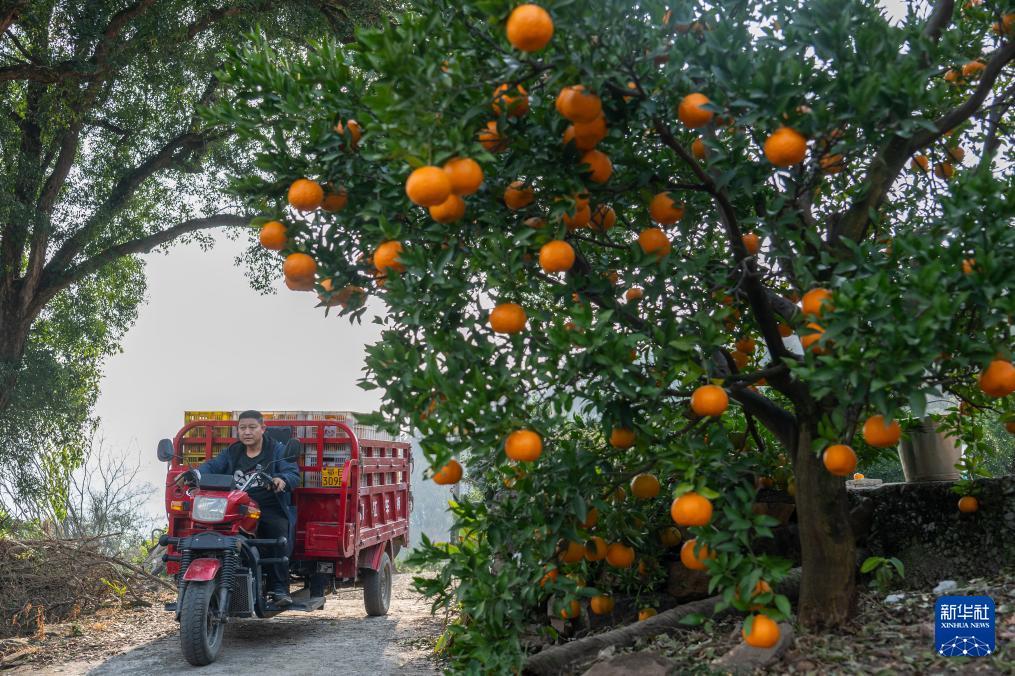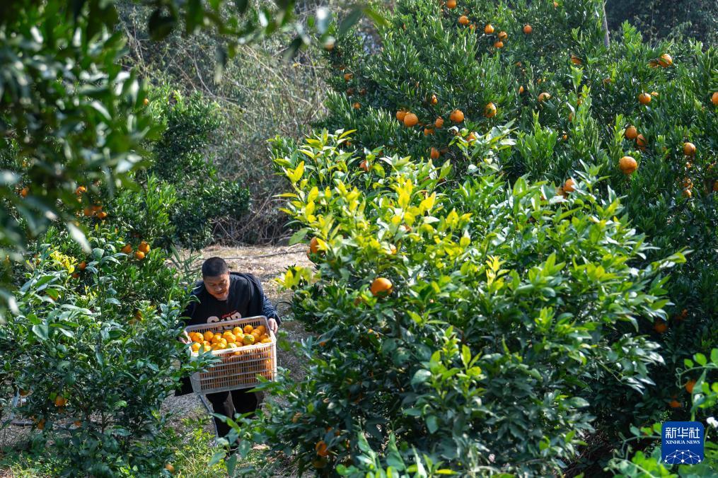 12月11日,在湖北省宜昌市长阳土家族自治县渔峡口镇岩松坪村,村民在搬运刚采摘的清江椪柑。 近日,湖北省宜昌市长阳土家族自治县渔峡口镇的清江椪柑进入采销旺季。2024年,全县清江椪柑种植规模达7万亩,年产值约5亿元。产品销往全国29个省市,并出口到马来西亚、加拿大、西亚等国家和地区。清江椪柑已成为当地乡村振兴战略的支柱产业。 新华社记者 杜子璇 摄