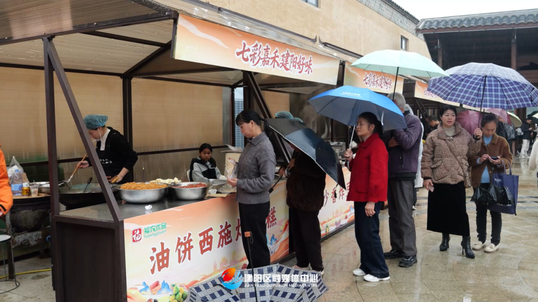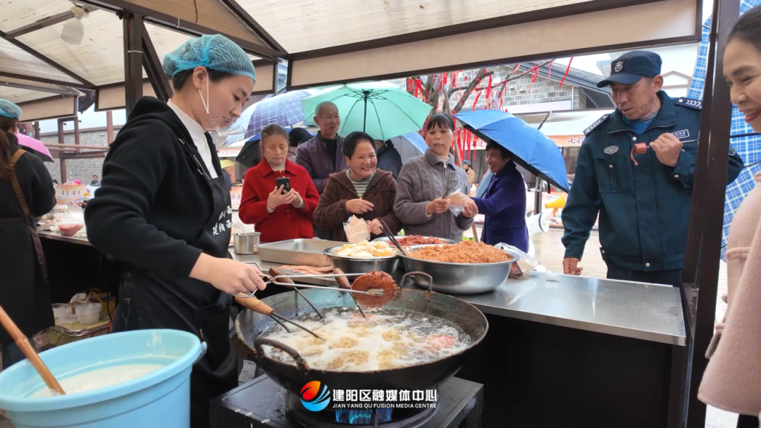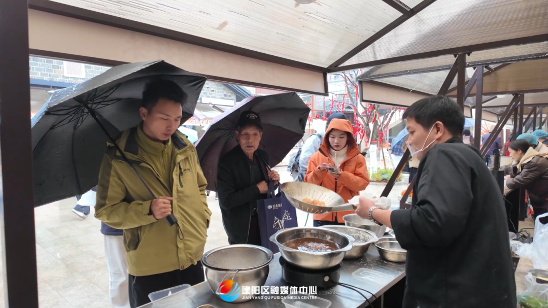 尽管天空飘着细雨,却丝毫没有影响市民们的热情,大家撑着伞,穿梭在各个小吃展位之间。刚出锅的水吉扁肉皮薄馅嫩,滚烫的西街灯盏糕金黄酥脆……地道的建阳风味纷纷出锅,食客们围在摊位前吃得津津有味。