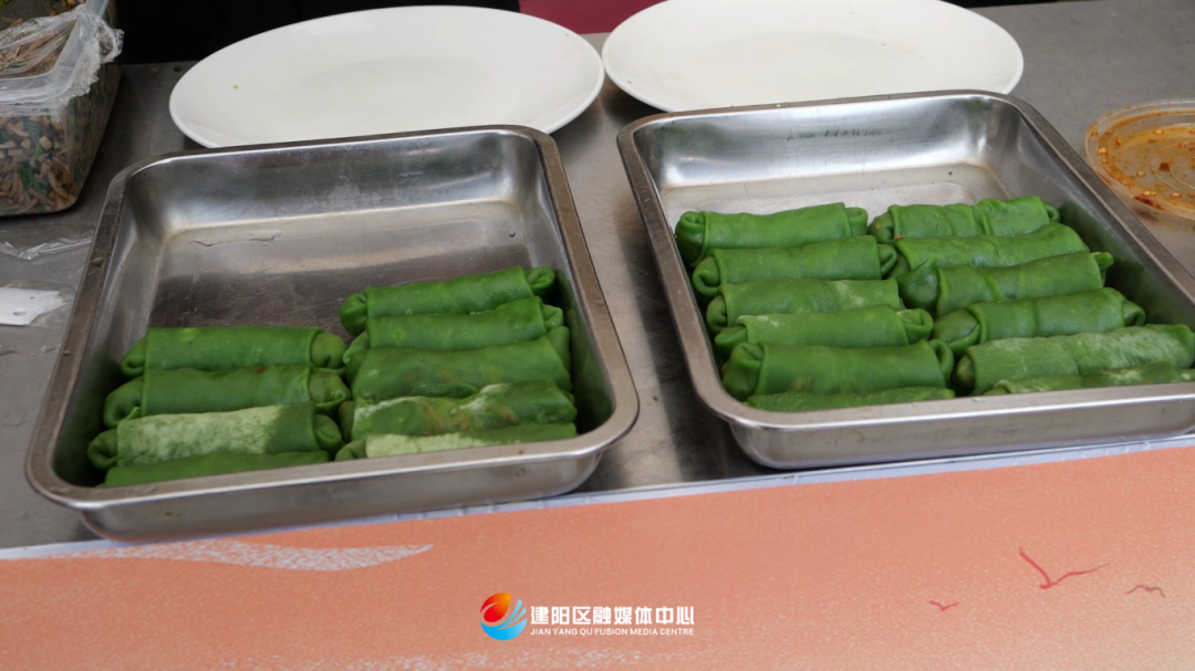 小吃摊主:“我们这个碧绿卷,这个皮,是用地瓜粉跟韭菜汁打成的浆,再煎成这个皮,这口感是非常软糯,同时也非常感谢主办方给我提供了这么好一个平台,有个展示自己店里美食的机会。”