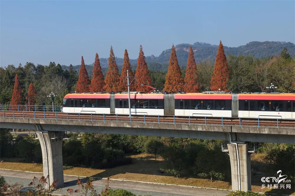 有轨电车行进在武夷山国家公园层林已然被晕染成斑斓的调色盘中