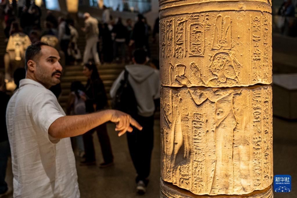 12月20日,游客在埃及吉萨的大埃及博物馆观赏纪念国王托勒密九世的石柱。 大埃及博物馆是世界上最大的专门展示单一文明(埃及文明)的博物馆,占地约50万平方米,馆藏文物超过10万件,于11月4日正式向公众开放。 新华社记者 辛梦晨 摄