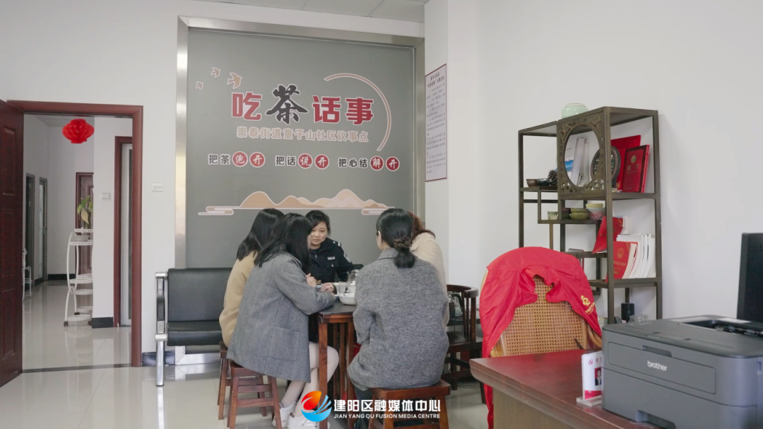 在位于童子山社区的“吃茶话事”点,崇泰街道平安指导员范俊琼正与社区工作人员一起对某小区的纠纷事件进行“会诊”。 童子山社区党委书记黄桂芝:“在社区,平时有些矛盾纠纷我们化解不了的,会及时联系一下社区的平安指导员,共同讨论化解办法。平安指导员的调解能力更强,法律知识更完善,挂点社区民警这种身份,让群众更加信任,大大提高了我们调解的工作效率。”