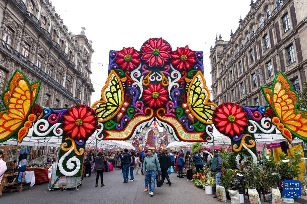 12月30日,在墨西哥首都墨西哥城,人们走过宪法广场附近的节日装饰。 2026年即将到来,墨西哥城多地装点节日装饰,洋溢着新年的喜庆气氛。 新华社记者 李梦馨 摄