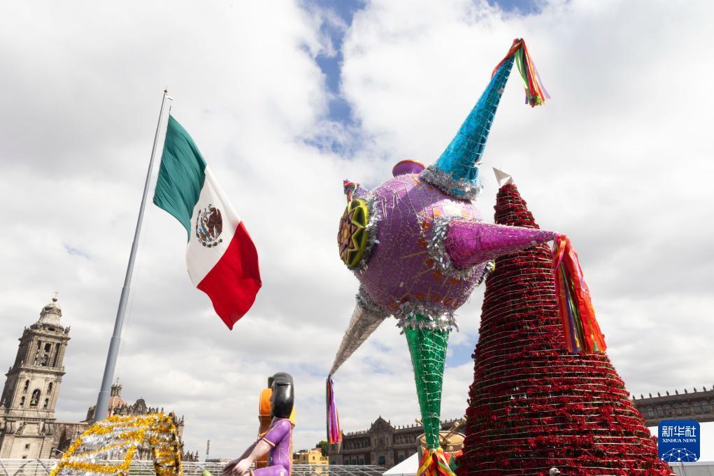 这是12月30日在墨西哥首都墨西哥城宪法广场拍摄的节日装饰。 2026年即将到来,墨西哥城多地装点节日装饰,洋溢着新年的喜庆气氛。 新华社记者 李梦馨 摄