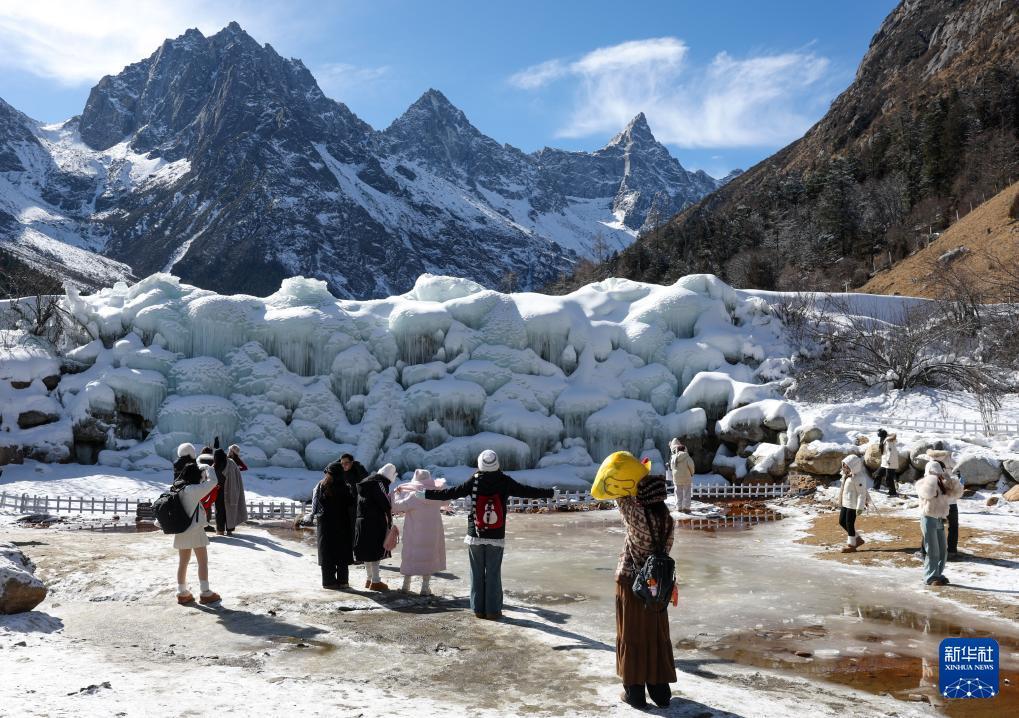 1月5日,在理县毕棚沟滑雪场,游客在冰瀑前留影。 1月5日,以“激情冰雪 活力四川”为主题的第十二届全国大众冰雪季(四川分会场)暨四川省第八届全民健身冰雪季活动在阿坝州理县毕棚沟滑雪场启幕。启动仪式上的川渝越野滑雪赛、冰雪装置打卡、冰雪动漫、冰雪非遗市集等嘉年华活动,让广大冰雪爱好者感受四川冰雪的独特魅力。 新华社记者 江宏景 摄
