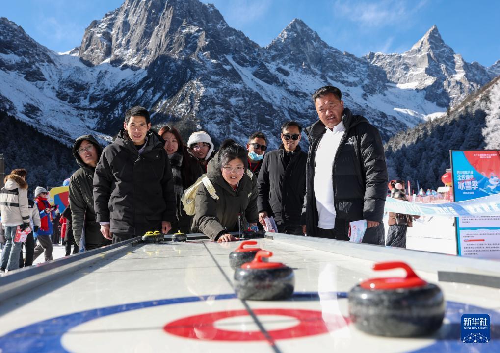 1月5日,游客在理县毕棚沟滑雪场里玩桌面冰壶球。 1月5日,以“激情冰雪 活力四川”为主题的第十二届全国大众冰雪季(四川分会场)暨四川省第八届全民健身冰雪季活动在阿坝州理县毕棚沟滑雪场启幕。启动仪式上的川渝越野滑雪赛、冰雪装置打卡、冰雪动漫、冰雪非遗市集等嘉年华活动,让广大冰雪爱好者感受四川冰雪的独特魅力。 新华社记者 江宏景 摄