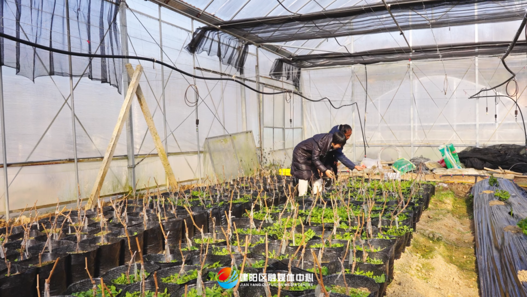 1月8日上午,在位于麻沙镇水南村的鲜美家庭农场里,科技特派员李正美与种植户一起查看套种在葡萄树下的马铃薯幼苗。马铃薯喜冷凉,但对霜冻敏感,种植在大棚内的马铃薯也受到了影响。