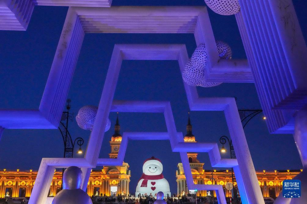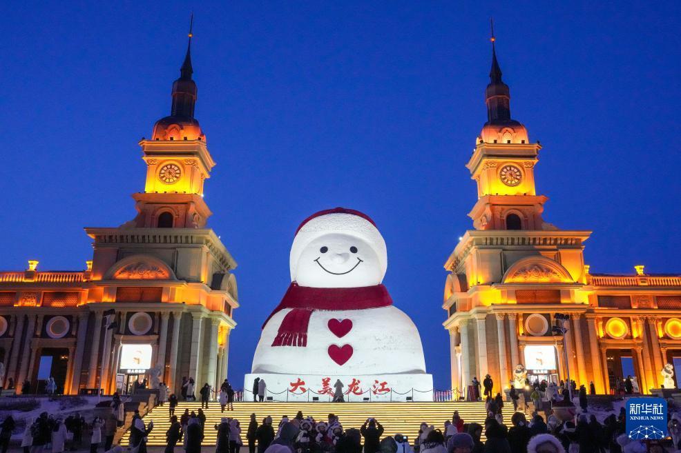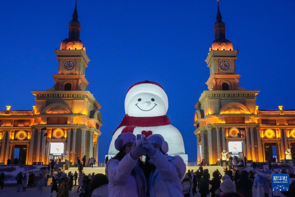 1月10日,游客在哈尔滨市群力音乐公园的大雪人前打卡拍照。 时下,“冰城”哈尔滨市正值冰雪旅游旺季。位于哈尔滨市群力音乐公园的大雪人吸引着众多游客前来打卡。日落后的蓝调时刻,在天光与灯光的交相映照下,大雪人更显浪漫迷人。 新华社记者 王建威 摄