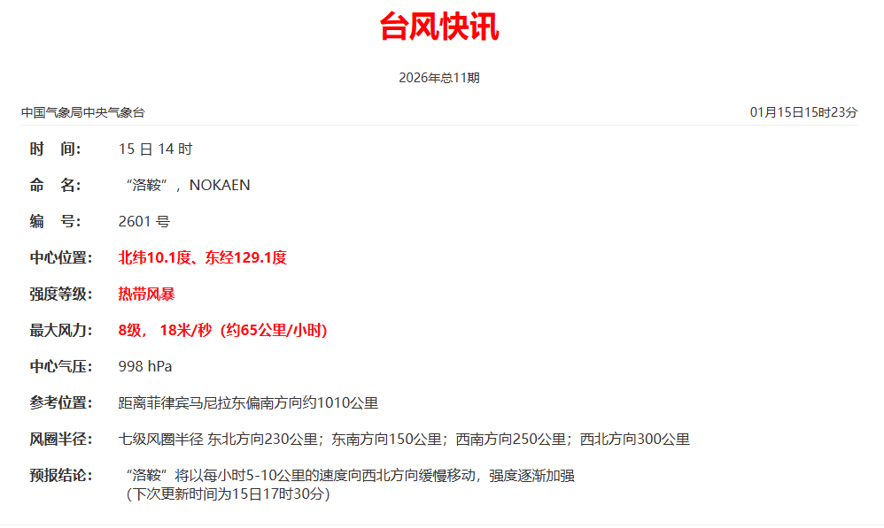 今年第1号台风“洛鞍”(热带风暴级;英文名称:Nokaen;名字来源:老挝;名称意义:一种鸟;燕子)于1月15日下午2时在菲律宾以东洋面生成,其中心位于菲律宾马尼拉东偏南方向约1010公里的洋面上,就是北纬10.1度、东经129.1度,8级(18米/秒),998百帕,7级风圈半径为150-300公里。预计,“洛鞍”将以每小时10-15公里的速度向西北方向移动,强度逐渐增强。