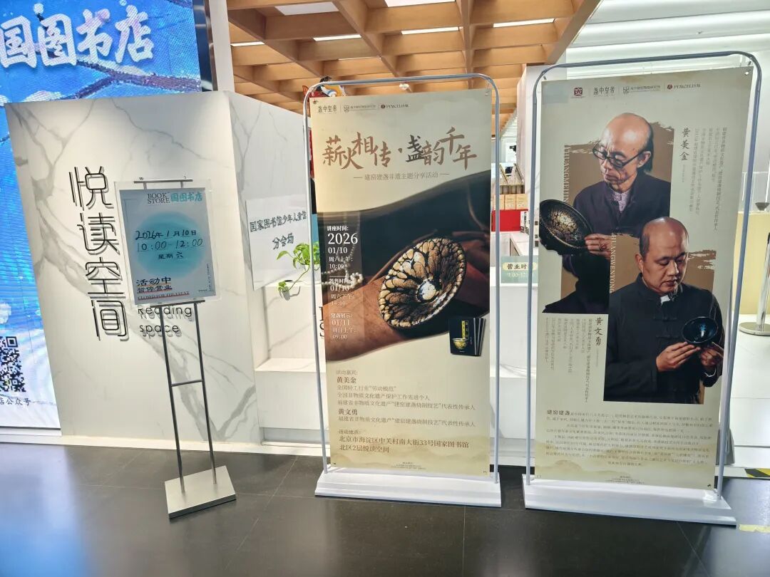 为弘扬中华优秀传统文化,展现建窑建盏非遗魅力与当代艺术创新实践,1月10日,北京国图书店有限责任公司携手北京窑火非物质文化遗产保护发展中心在国家图书馆北区国图书店(悦读空间)成功举办“薪火相传·盏韵千年”——建窑建盏非遗主题分享活动,部分在京陶瓷艺术家、建盏爱好者出席活动。