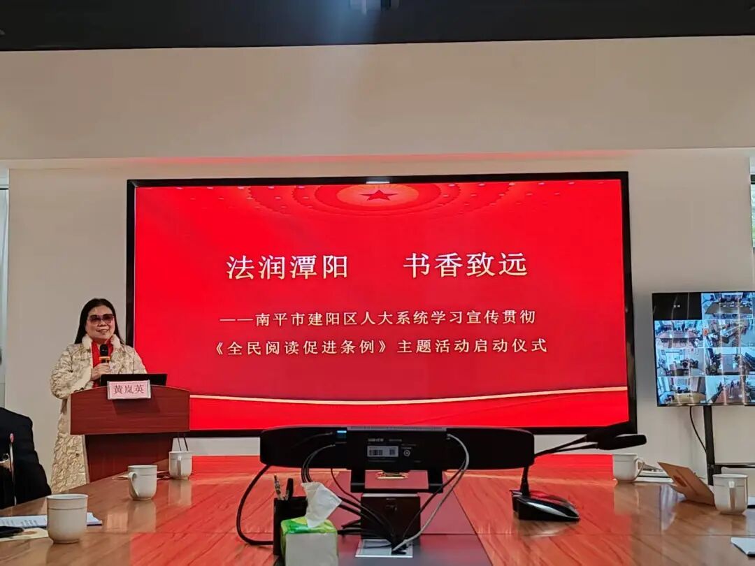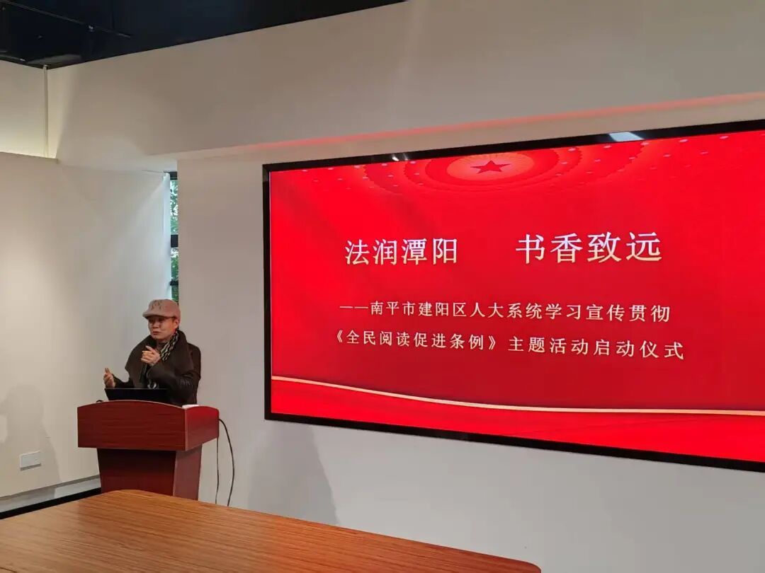 2月1日,《全民阅读促进条例》(以下简称《条例》)正式施行之日,南平市建阳区人大常委会隆重举行“法润潭阳・书香致远”主题系列活动启动仪式。活动以南平市建阳区全过程人民民主实践中心暨人大代表之家为主会场,连线各乡镇(街道)人大代表联系服务群众活动室,通过“领导干部领学+专家辅导+条例解读”的形式,全面拉开全区人大系统学习宣传贯彻《条例》的序幕,为“书香建阳”建设注入法治动能。 区人大常委会党组书记、主任郑立新出席仪式并作动员讲话。他指出,开展“法润潭阳・书香致远”系列活动,是区人大常委会深入贯彻习近平新时代中国特色社会主义思想和习近平文化思想的具体实践,更是落实党中央、省委、市委关于全民阅读工作要求及区委、区政府“书香建阳”建设部署的重要举措。他强调,全区人大系统要以《条例》施行为契机,充分发挥职能优势,推动法规实施与建阳实际深度融合,引导人大干部、人大代表成为《条例》的宣传者、践行者和监督者,在全社会营造“爱读书、读好书、善读书”的浓厚氛围。
