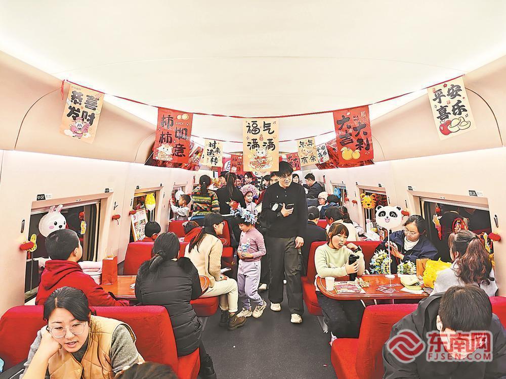 “遛娃舱”里孩子们玩得开心,家长们省心。 东南网2月2日讯(福建日报记者 张文奎 通讯员 付文 文/图) 1日10时左右,记者在G1654次高铁列车上看到,在餐车区改造的“遛娃舱”里,铺设有防摔软垫,配备精选绘本和积木、拼图等益智玩具,孩子们在家长的陪伴下开心玩耍,打发旅途时光。 今年春运,南铁福州客运段在G1654、G1674等长编组列车上,首推“静音车厢”与“遛娃舱”协同服务体系。通过“静音区严守规范、活动区释放天性”的分区管理模式,既保障了旅客对安静旅途的需求,又为携童家庭提供了安全、有趣的亲子空间。 一车两区,有效破解了春运“带娃与静音”两大难。G1654列车长张苗苗介绍,在严格执行静音车厢“低声广播、无音视频、轻声服务”标准的同时,列车将餐车区域创新升级为“遛娃舱”。这种“动静分离、功能互补”的空间设计,物理区隔了“安静休息”与“亲子互动”的不同需求,有效避免了儿童天性释放对静音环境的潜在干扰。家长不再提心吊胆,渴求安静的旅客也得以安心休憩或工作。 在维护静音环境的同时,也要让孩子们“动”得有趣。为此,福州客运段巧妙引入福建特色文化元素,将“遛娃舱”升级为传递乡情与美的“流动文化体验馆”,开设“簪花手作小课堂”。青年志愿者化身文化使者,耐心指导孩子与家长一起,用彩线、绢花等材料制作精美的簪花饰品。