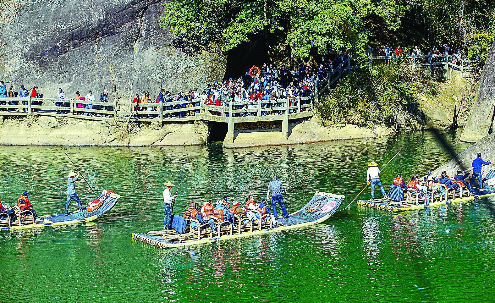 2月20日,正月初四,武夷山旅游市场热度持续攀升,围绕“春来武夷,马上有福”主题,当地推出了一系列诚意满满的惠民政策和年味十足的特色活动,凭借独特的山水魅力和浓厚的年味氛围,春节假期前六日接待游客量位列全省第一。图为武夷山景区内游人如织。(张筱惜 彭善安 摄)