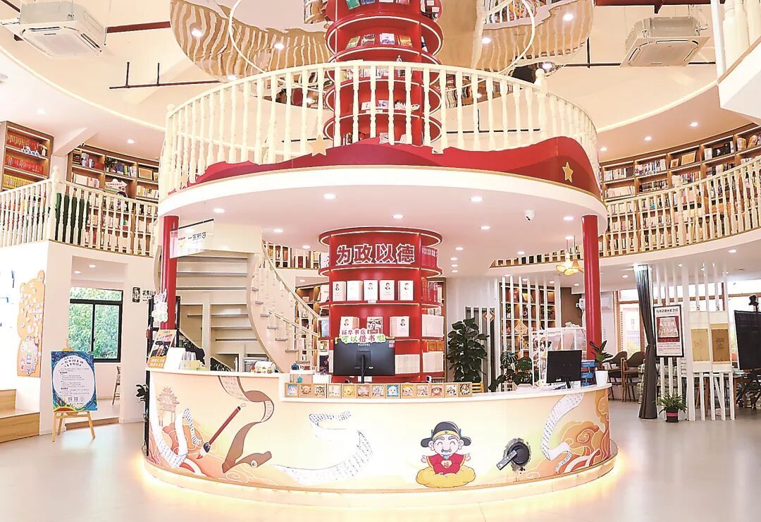 书店工作人员蔡宇向记者介绍,该店于2024年9月揭牌运营,面积382平方米,藏书2万余册,朱子文化相关图书500多种。不仅设有党政读物专区、朱子图书专区,还有朱子文创区、绘本阅读区、武夷山水茶空间等多个功能区。 朱子文创区里,以朱子语录、建本雕刻、建盏纹样为灵感设计的文具、茶器、手工艺品等,将古老智慧化作可触摸的日常。绘本阅读区则铺着柔软的地垫,墙面绘有卡通版朱子形象,孩子们或坐或卧,在色彩斑斓的图画书中认识世界,亲近朱子文化。最令人流连的当数武夷山水茶空间。读者可捧一册书、沏一壶茶,在书页翻动与茶汤流转间,体味“半亩方塘一鉴开,天光云影共徘徊”的悠然意境。 慈眉善目的朱子爷爷,始终立于门侧,注视着每一个推门而入的人——仿佛是某种无声的邀约:进来坐坐吧,读一本书,便是与先贤对坐,与天地往来。 一间“家门口的暖心书房” 结束忙碌后的星期五夜晚,“80后”读者孙雪琳再次来到这家书店。记者遇见她时,她正带着两个娃在店里享受阅读时光。 “大多数时候,大宝会自己跑到书店二楼安安静静地看书,小宝则要我陪着念一会儿绘本。”孙雪琳告诉记者,作为地道的建阳人,这片古老土地所承载的厚重文脉在潜移默化中早已深入她的潜意识,总把她引向有书的地方。尽管如此,书店开业后,她却没在第一时间成为书店的读者。在她看来,所谓的“主题书店”,多数只是噱头,并不一定能满足她的阅读需求。 “直到2025年2月,带娃在书店附近的培训班上课时,经别的家长介绍,我才迈入这家书店。”进入书店以后,孙雪琳才发现,这家书店与她之前想象的很不一样:图书不但新,而且种类多,不仅有适合幼儿阅读的绘本,还有许多专业书籍,基本可以满足多样的阅读需求。于是,她立即办理了“365新华悦读借阅卡”——持有该卡的读者既可以在一年内无限次免费借阅图书,又可以在一年后将充值款用于店内消费。不到一年,她的借阅卡已登记有近50条借阅记录,其中社科类图书居多。