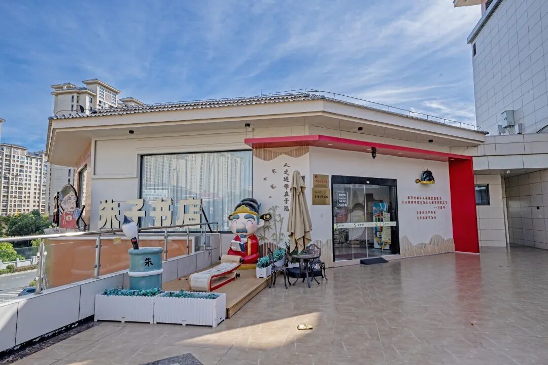 走进书店,迎面便是一股淡雅的书香。从《四书章句集注》到《朱子家训》,从学术研究专著到普及读本,各类版本济济一堂。墙上,朱子生平轨迹与行迹示意图徐徐展开,读者可循着这些文字与线条,逐步走进这位大儒的世界。 这家书店的特别之处不仅在于其融书店与公益书吧的功能于一体——店内的图书皆可免费拆阅,还在于它的“代言人”与众不同:他穿越历史而来,以可爱慈祥的卡通形象,立于书店门侧,静候每一位访客——而他正是朱子爷爷。