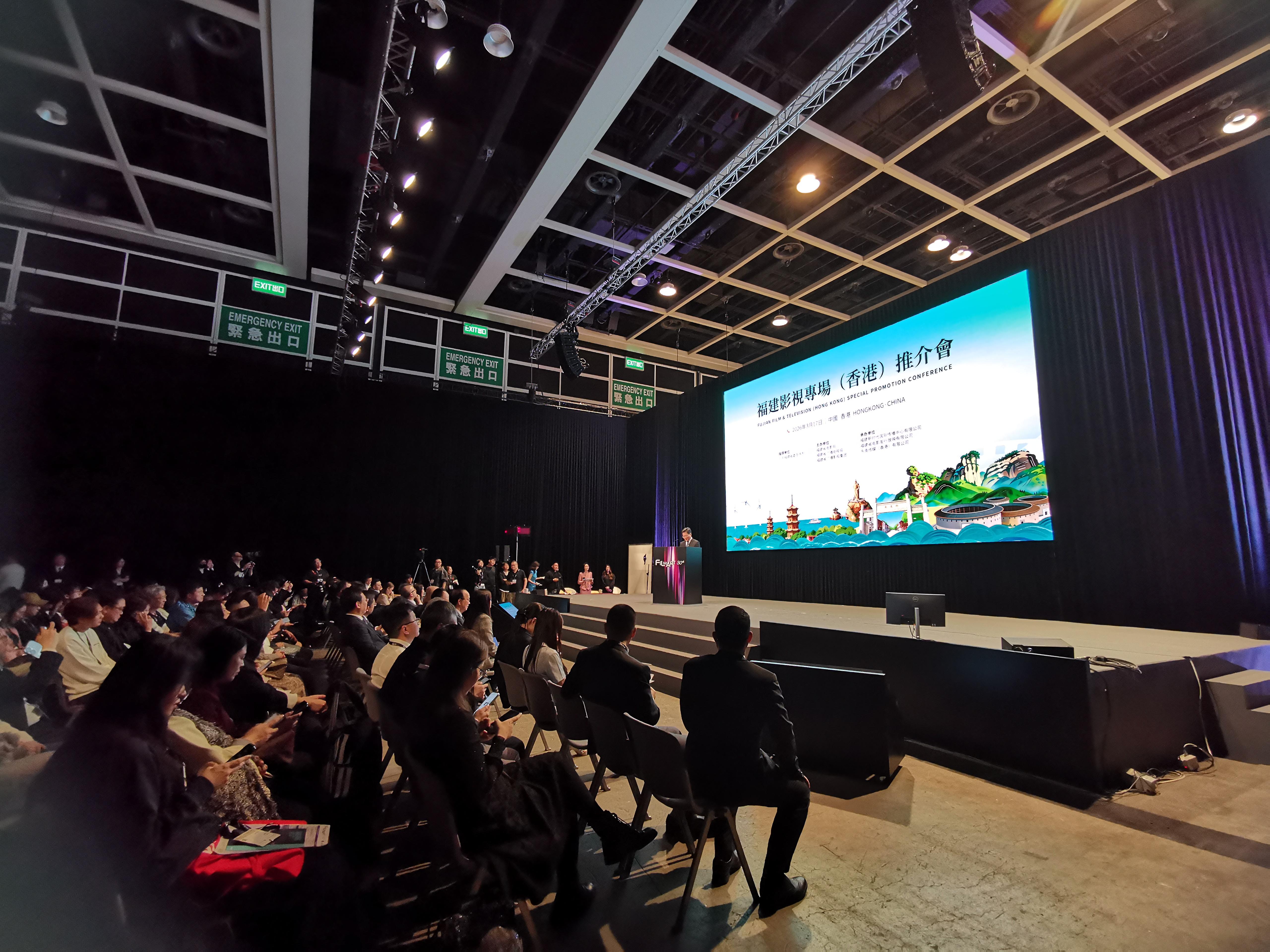 福建日报·新福建客户端3月17日讯(记者 林清智)3月17日,福建影视专场(香港)推介会在香港会议展览中心影剧院举行。作为第30届香港国际影视展的配套活动,本次推介会由福建省委宣传部指导、福建省电影局主办,以“有福电影 合作共赢”为主题,通过参观展示、政策解读、项目推介、签约合作等形式,展现福建影视产业发展成果与合作潜力,搭建闽港影视深度合作桥梁。福建省委宣传部、香港贸发局、香港福建社团联会、香港电影制片家协会等相关负责人出席并致辞,香港各界知名人士、福建影视企业代表等200余人参加活动。