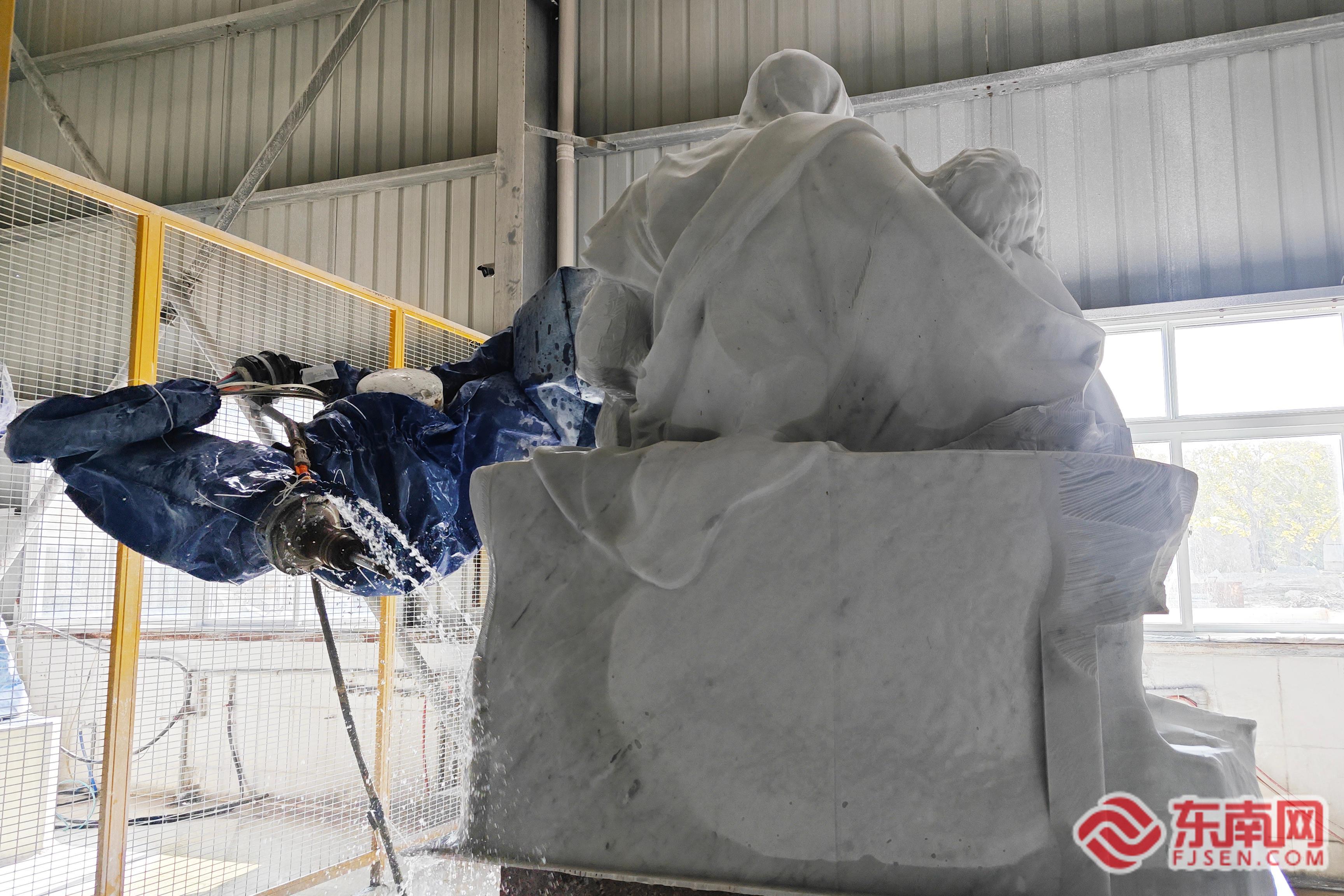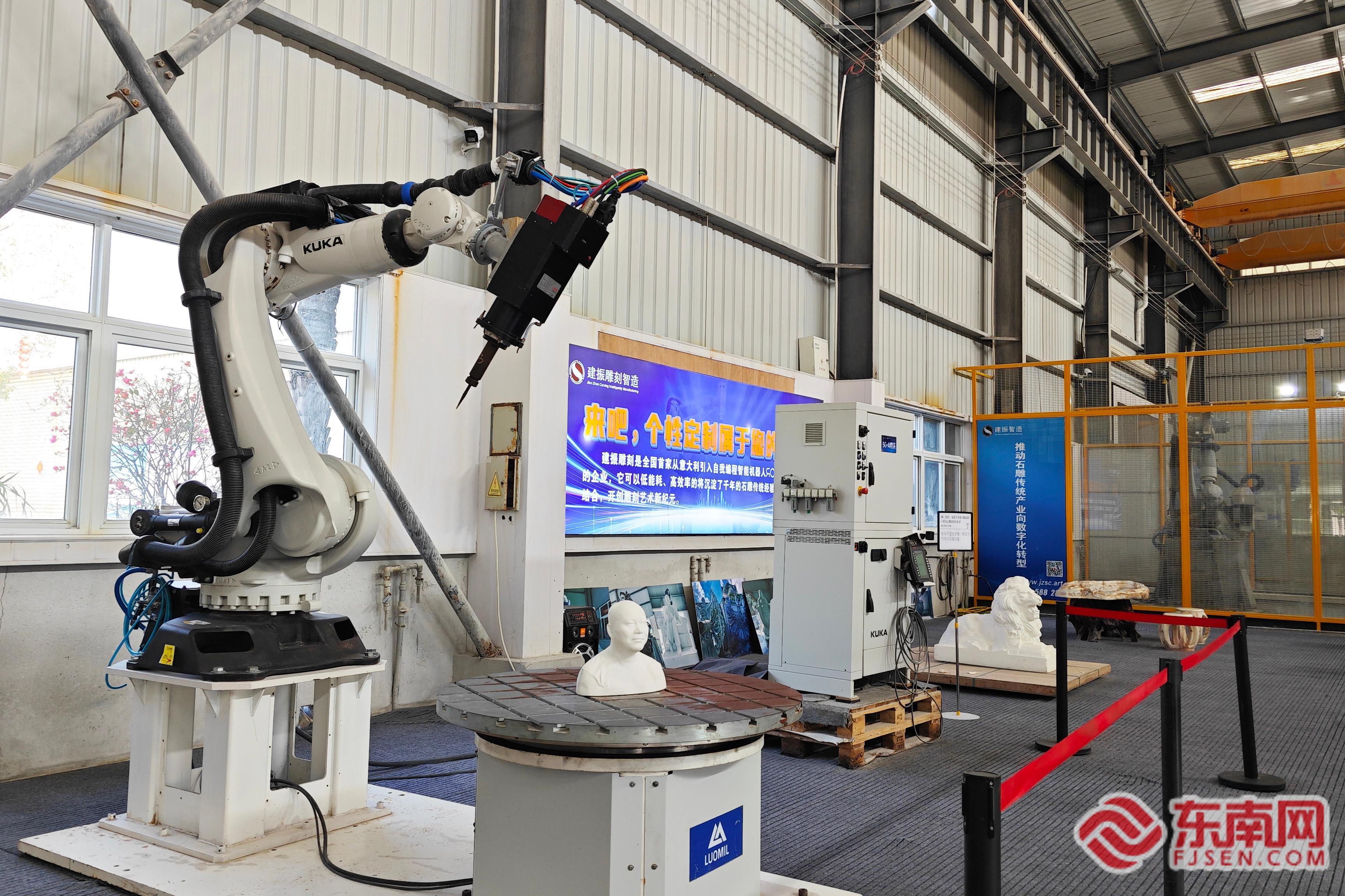 石雕刻数字化智造车间展示。东南网记者 林杰 摄 车间里的“数字革命”:从粉尘飞扬到静默生产 走进惠安建振石业有限公司石雕刻数字化智造车间,眼前的景象颠覆了人们对石雕工场的传统认知。没有震耳的凿击声,没有弥漫的粉尘,只有机器低沉的运转声和偶尔闪烁的提示灯。数台智能雕刻机器人正挥舞着机械臂,精准地在石料上雕琢,业界将这些机器人称为“数字雕刻师”,它们雕刻高度可达2米多,能够完成大部分3D设计雕刻任务。 “我们正在进入一个新的雕刻时代,不再是由碎石、凿子和灰尘组成,而是由设计、3D建模、扫描、智能机械加工、人工精修优化细节组成。”公司负责人曾振保这样描述当下的变革。 这套来自意大利的雕刻机械手系统将传统工匠的石材加工经验与机器人技术完美结合,只需几个简单的手动操作,便可自动工作,同时还具备远程诊断、干预等功能。更重要的是,它有效解决了传统人工雕刻粉尘大、污染环境等顽疾,使作业环境达到国家环保、安全生产要求,兼具还原度高、成本低等优势。智能生产设备的推广,直击惠安石雕产业长期以来的两大痛点——环保压力与用工困境。石粉可通过水冲沉淀实现循环利用,有效解决了环保问题。 在曾振保看来,引进智能雕刻机器人只是技术改革,并非真正的数字变革。“它只是减少了噪音和做到了精细,数字化的核心改革是体系的改革,从组织、生产、销售、服务一条龙的智能化变革。”正是基于这一认知,他带领公司打造了石创基地,布局观光工厂、文创空间、直播平台等新业态,试图重构石雕产业的商业模式。曾振保认为,智能设备不会对就业产生冲击,“机器人只是做一些人不愿意做的工作,比如脏活累活和危险类别,应当把创作留给人类,把制造让给智能机器人。”
