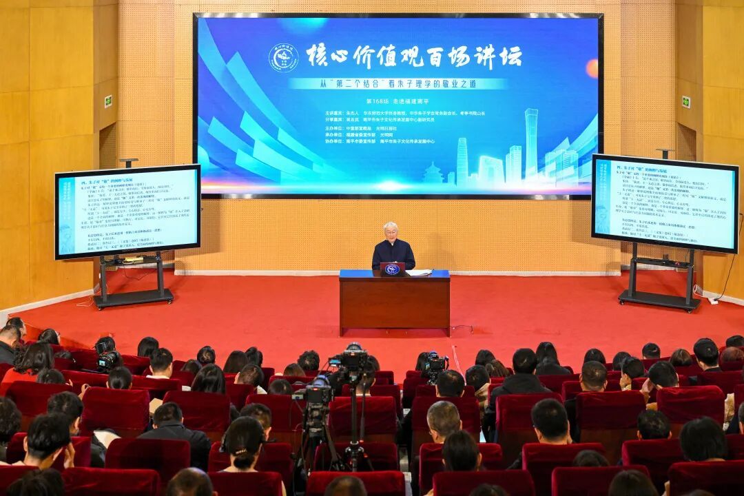 3月27日,“核心价值观百场讲坛”第168场活动在南平市建阳区考亭书院举行。此次活动以“从‘第二个结合’看朱子理学的敬业之道”为主题,华东师范大学终身教授朱杰人作宣讲报告。
