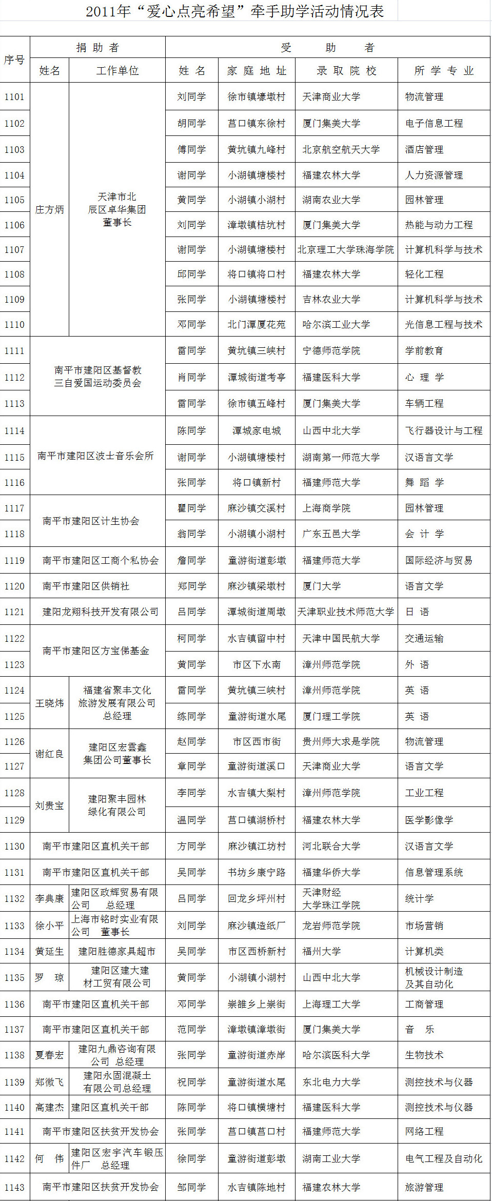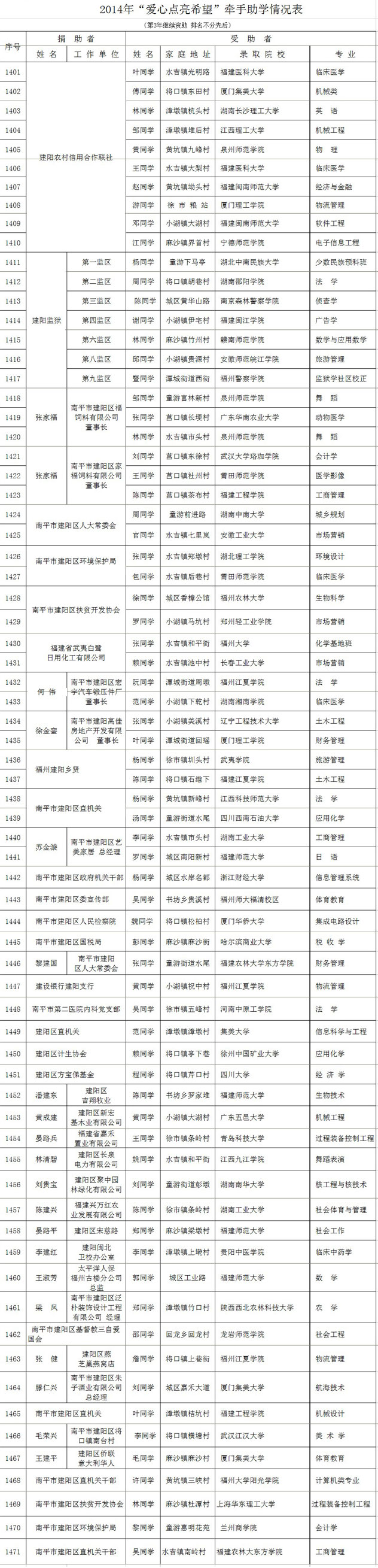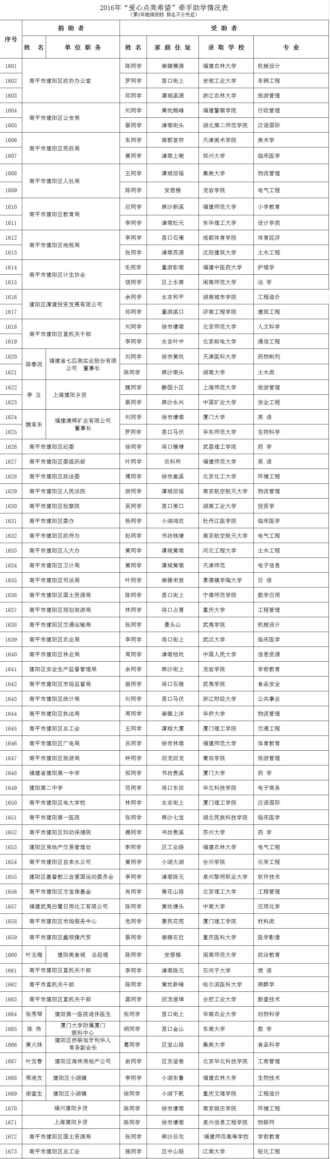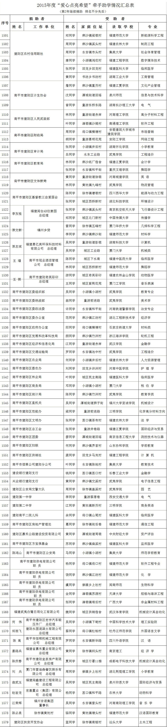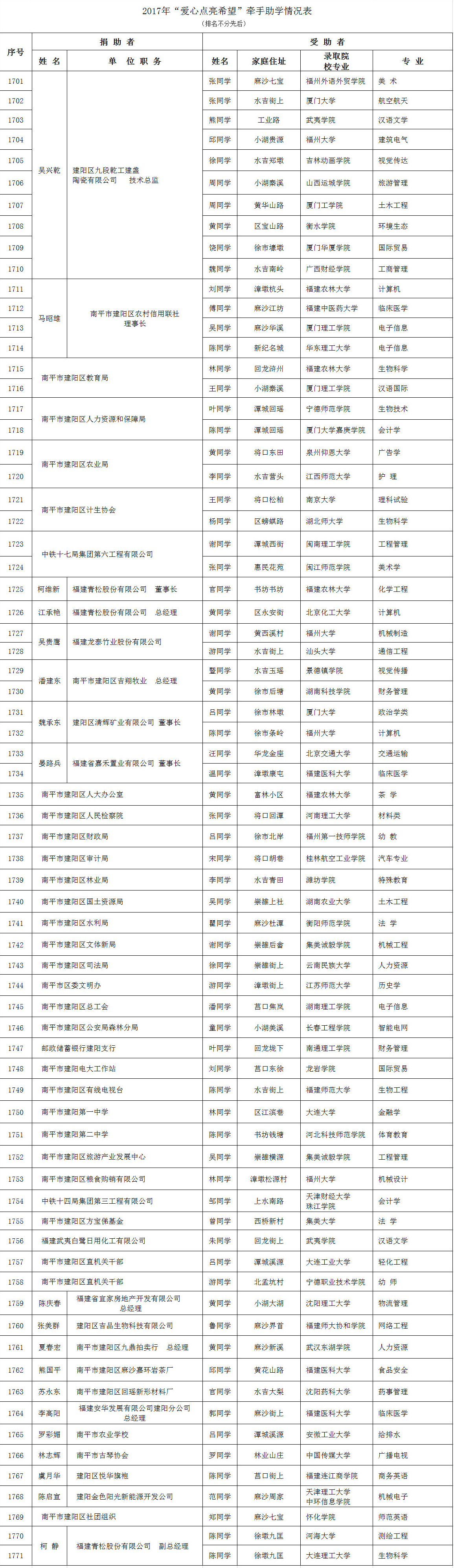 为答谢社会各界爱心人士参与“爱心点亮希望”牵手助学活动,现将2017年开始助学且2014—2016年今年继续助学的名单及2011—2013年助学情况(排名不分先后)公布如下: